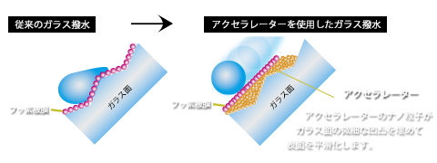 撥水の基材となるフッ素の定着量を劇的に増加するアクセラレーター技術(Zen-Xeroシステム)を開発し、フッ素が持つ撥水性や耐久性を100%引き出します。 さらにアクセラレーターによりガラス表面の圧倒的な平滑化を実現することで、ワイパーの動作をスムーズにし欧州車などで発生する「ビビリ」を大幅に軽減します。
